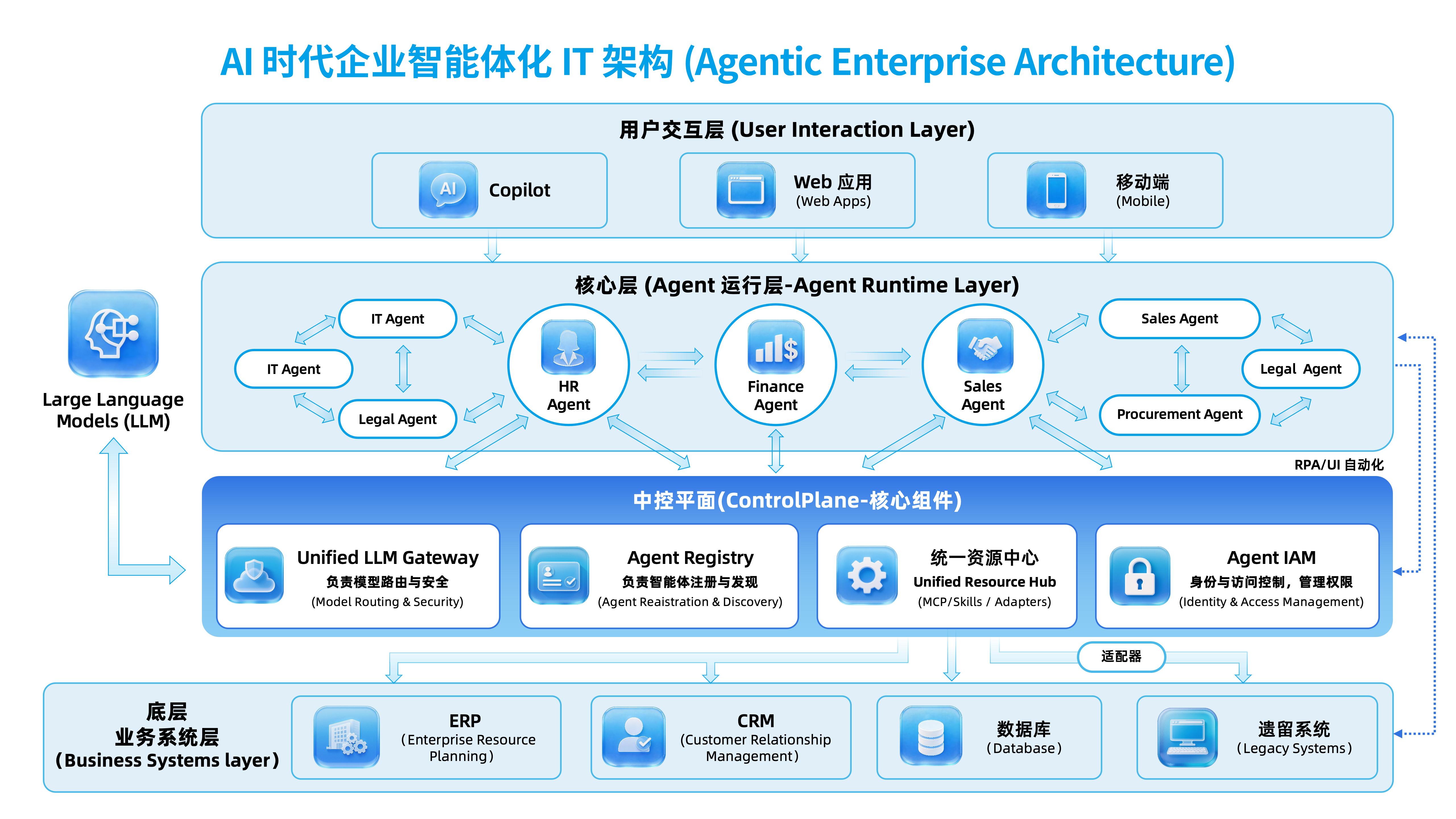 这是架构最剧烈的变化。请注意图中的HR Agent、Finance Agent、Sales Agent——它们不再是孤立的系统,而是一个能够相互协作的智能体网络。