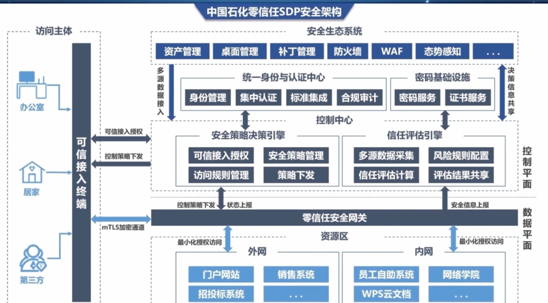 为切实落实企业数字化转型过程中的网络安全保障工作,中国石化集团提出十四五网络安全愿景,在十四五期间建成动态综合、攻防一体的网络安全能力体系,助力集团数字化业务新发展,为全面实现“建设世界领先洁净能源化工公司”保驾护航。十四五规划中提出要以零信任理念为基础,聚合安全支持系统及服务能力,以数字身份为基石,构建用户、设备、网络、资源完整信任链,对业务访问进行持续信任评估和动态访问控制。