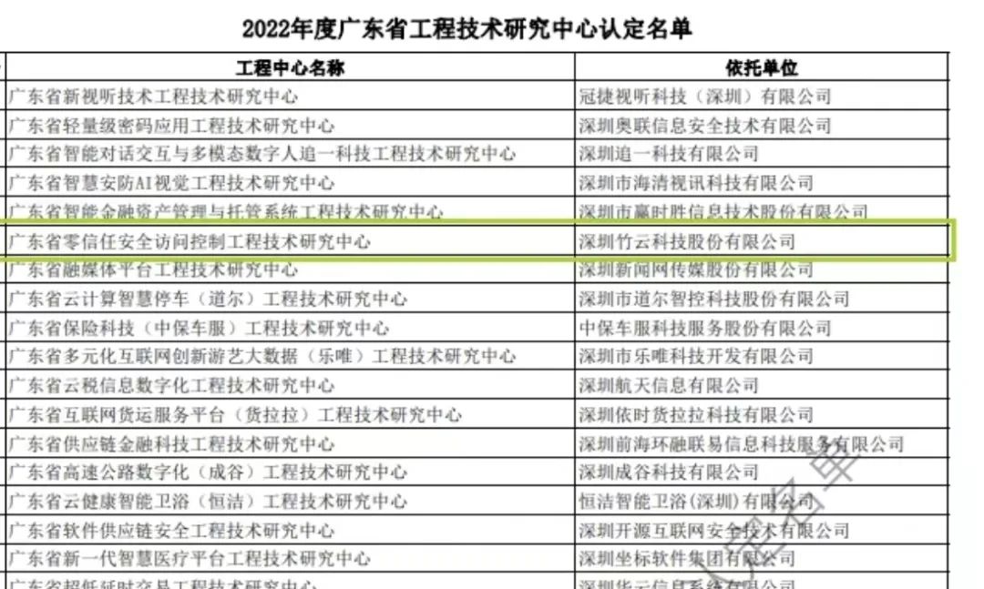 近日,为深入实施创新驱动发展战略,充分发挥广东省工程技术研究中心在产业技术研究开发、科技成果转化方面的作用,支撑广东省产业高质量发展,按照相关要求,经专家评审和网上公示,广东省科技厅正式公布2022年广东省工程技术研究中心认定名单,深圳竹云科技股份有限公司(简称“竹云”)筹建的“广东省零信任安全访问控制工程技术研究中心”通过认定,实力入选。