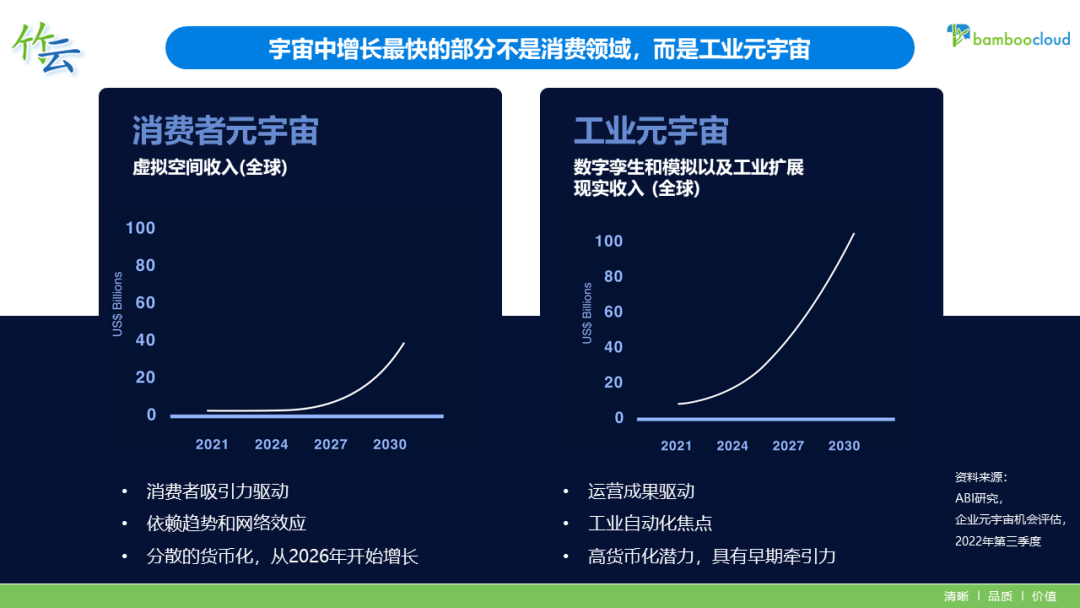 两年前,当Facebook 更名为 Meta时,“Metaverse ”这个词一夜之间在全球范围内家喻户晓。什么是元宇宙?元宇宙一词是由科幻小说作家尼尔·斯蒂芬森在《雪崩》中创造的。他的虚拟宇宙是人类作为可编程的化身,在三维虚拟空间中与其他用户相互交互。因为 Meta(Facebook)是一家社交媒体公司,元宇宙这个词突然诞生并在全球范围迅速传播,多数公众在听到 元宇宙这个词时都只会想到去中心化、消费者、零售、社交或数字资产。而实际超过预想的是,元宇宙中增长最快的部分不是消费领域,而是工业元宇宙。用一句话简单理解,元宇宙的定义是:人以数字身份参与的数字世界或虚拟现实空间,用户可以在虚拟现实空间中与其他用户进行交互。
