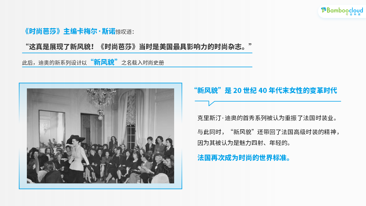 从 1938 年到 1947 年,没有人会考虑时尚。人们穿着朴素,不仅是因为物资短缺,更是因为战争带来的情感创伤。克里斯汀·迪奥 (Christian Dior) 厌倦了当时主导时装设计的朴素风格,于是他决定冒险一试,于 1947 年 2 月 12 日推出了他的首个春夏时装系列。在公司总部的沙龙中,由6 位模特展示了 90 款系列的时尚服饰。这一系列大获成功。《时尚芭莎》主编卡梅尔·斯诺惊叹道:“这真是展现了新风貌!”《时尚芭莎》当时是美国最具影响力的时尚杂志。此后,迪奥的新系列设计以“新风貌”之名载入时尚史册。