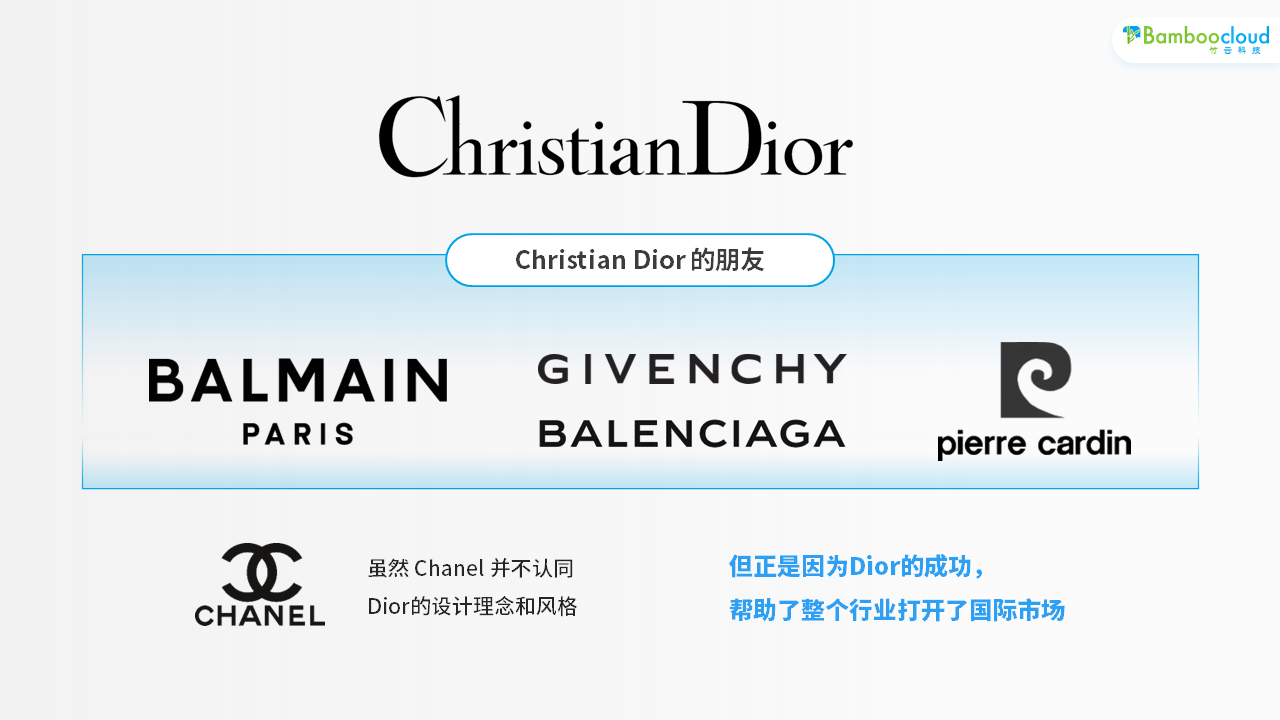 Balmain、Givenchy、Balenciaga、Pierre Cardin,这些都是 Dior 的设计师朋友,虽然 Chanel 并不认同 Dior的设计理念和风格,但正是因为Dior的成功,帮助了整个行业打开了国际市场。