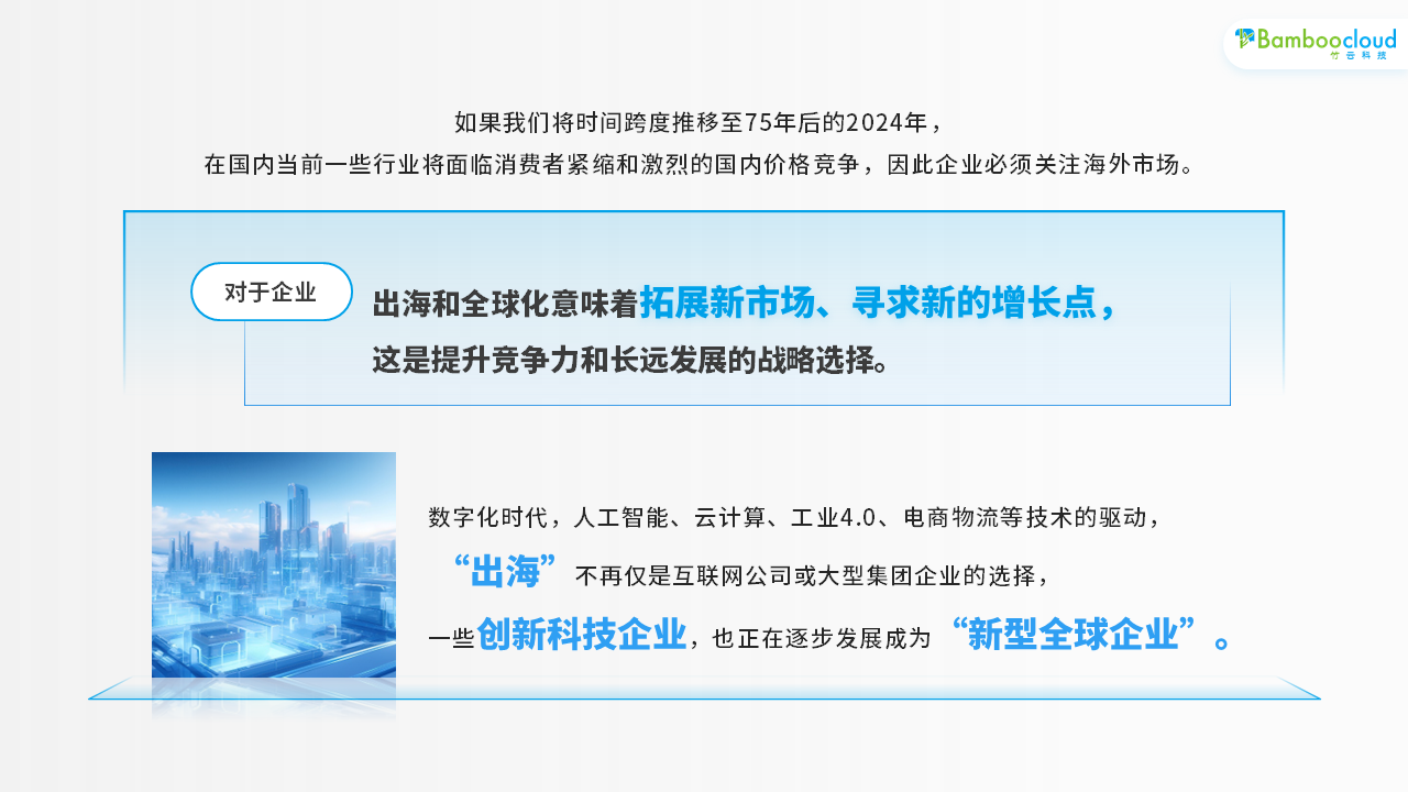 如果我们将时间跨度推移至75年后的2024年,在国内当前一些行业将面临消费者紧缩和激烈的国内价格竞争,因此企业必须关注海外市场。对于企业来说,出海和全球化意味着拓展新市场、寻求新的增长点,这是提升竞争力和长远发展的战略选择。我们看到更多的企业都已开始加速出海步伐。数字化时代,人工智能、云计算、工业4.0、电商物流等技术的驱动, “出海”不再仅是互联网公司或大型集团企业的选择,一些创新科技企业,也正在逐步发展成为“新型全球企业”。
