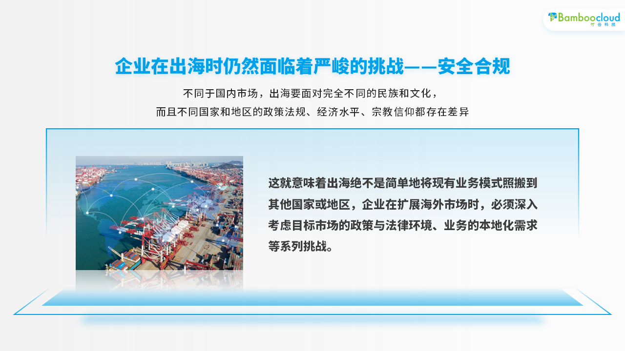 然而,企业在出海时仍然面临着严峻的挑战——安全合规。不同于国内市场,出海要面对不同的民族和文化,并且不同国家和地区的政策法规、经济水平、宗教信仰都存在差异,这就意味着出海绝不是简单地将现有业务模式照搬到其他国家或地区,企业在扩展海外市场时,必须深入考虑目标市场的政策与法律环境、业务的本地化需求等系列挑战。