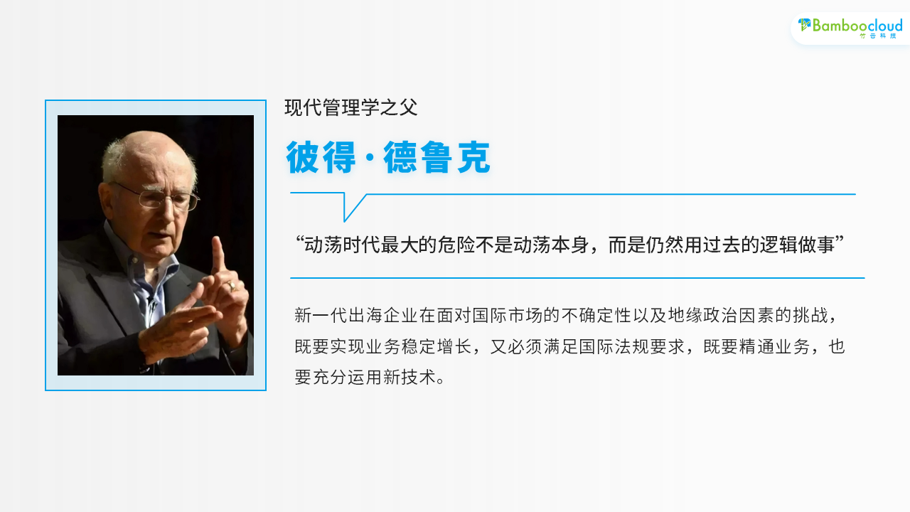 正如现代管理学之父彼得·德鲁克提到:“动荡时代最大的危险不是动荡本身,而是仍然用过去的逻辑做事。”新一代出海企业在面对国际市场的不确定性以及地缘政治因素的挑战,既要实现业务稳定增长,又必须满足国际法规要求,既要精通业务,也要充分运用新技术。