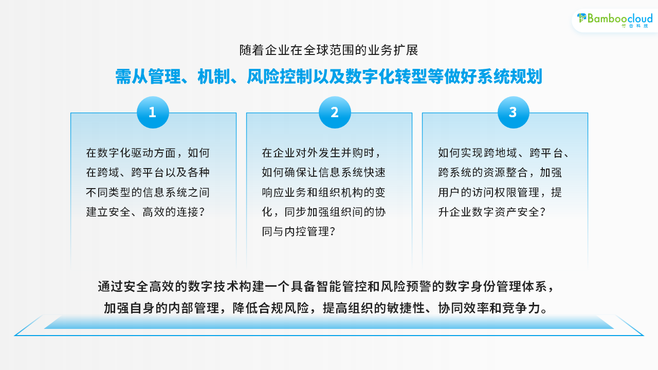 与此同时,随着企业在全球范围的业务扩展,需从管理、机制、风险控制以及数字化转型等做好系统规划。比如在数字化驱动方面,如何在跨域、跨平台以及各种不同类型的信息系统之间建立安全、高效的连接?在企业对外发生并购时,如何确保让信息系统快速响应业务和组织机构的变化,同步加强组织间的协同与内控管理?如何实现跨地域、跨平台、跨系统的资源整合,加强用户的访问权限管理,提升企业数字资产安全?通过安全高效的数字技术构建一个具备智能管控和风险预警的数字身份管理体系,加强自身的内部管理,降低合规风险,提高组织的敏捷性、协同效率和竞争力。