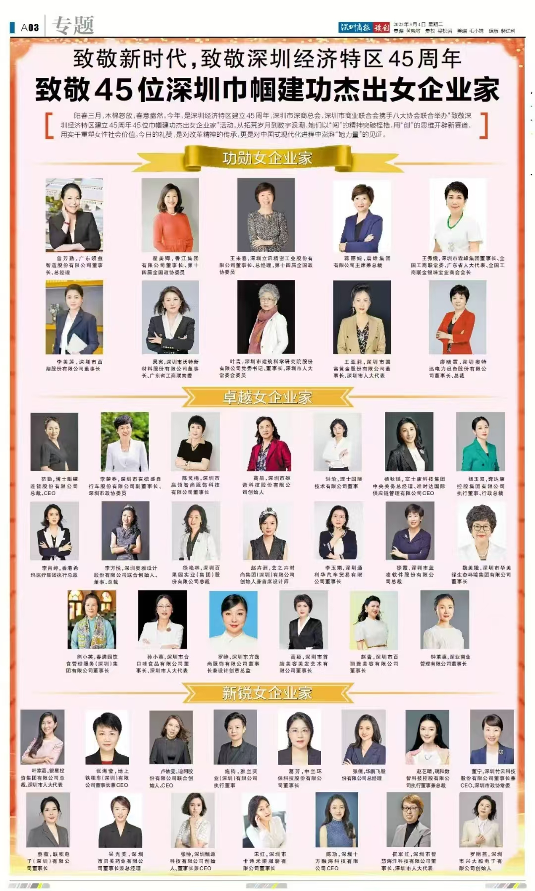 今年,是深圳经济特区建立45周年,深商会联合党委、深商总会、深圳市商业联合会、深圳市老字号协会、深圳市中小企业公共服务联盟、深商研究会、深圳市女科技工作者协会、深商公益基金会联合举办“致敬深圳经济特区建立45周年45位巾帼建功杰出女企业家”活动。3月4日,深圳商报重磅发布《致敬45位深圳巾帼建功杰出女企业家》专题报道,表彰为深圳高质量发展作出卓越贡献的女性企业家代表。