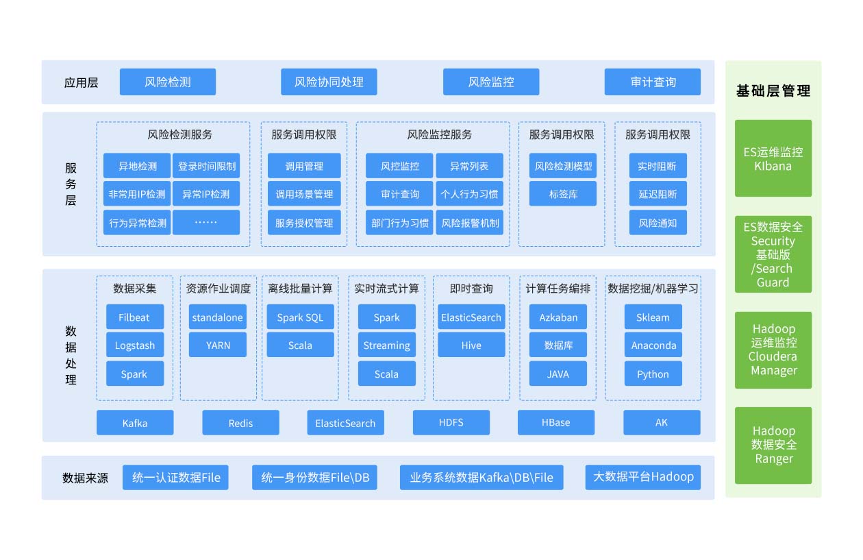 风险引擎建立在大数据平台的基础上,采用了Hadoop、Spark、Streaming、ELK、ETL等技术,能够持续汇聚IAM体系和企业资源各个节点的海量数据,支撑风险模型的建立和持续优化。